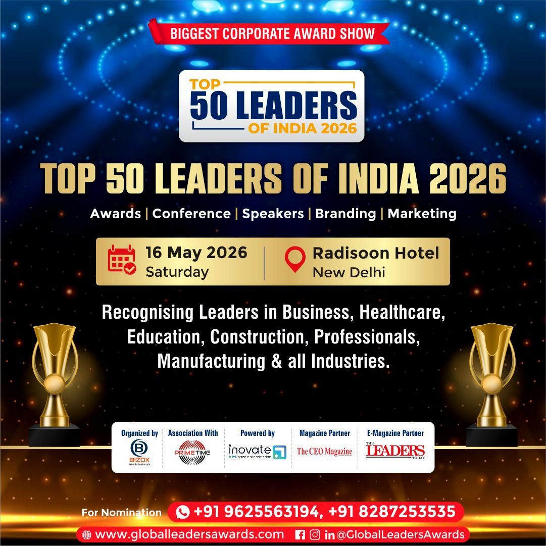 Top 50 Leaders of India 2026 is scheduled to be held on 16th May 2026 at Radisson Hotel, New Delhi, India. The Award show is organized by Bizox Media Network, Association with Prime Time Media, Powered by I-Novate Technology Ltd., Magazine Partner by The CEO Magazine, and The Leaders Today in the beginning presence of Ministers and Bollywood Celebrities with over 250 delegates coming together to network with peers and Business Leaders form PAN India. The Awards are supported by respected Cabinet Ministers, Members of Parliament, Bollywood Celebrities, top Bureaucrats, Thought Leaders and business excellence, Foreign Dignitaries, and Public Figures from around India, and delivered by Bizox Media Network Pvt. Ltd.